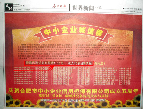 安徽东维铝业有限责任公司经过十二年的艰苦创业,一直细心维护企业的形象,诚信地运作企业,多次被各大政府机构及社会团体评选为诚信企业。合肥市中小企业信用担保有限公司在最近几年对我公司的融资担保提供了很大的帮助,我公司一直也以诚信对待该公司的信任,积极配合各项检查工作。本次时值该企业成立五周年之即,我公司热烈祝贺合肥市中小企业信用担保有限公司更上一层楼,事业蒸蒸日上。(附2007年10月23日《合肥晚报》第14版)