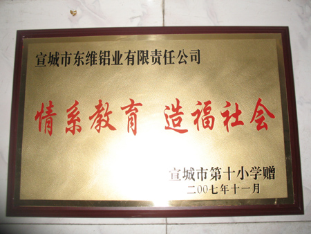 宣城市东维铝业有限责任公司隶属于安徽东维集团。多年来,公司大力倡导济困扶贫,致力于残疾人等福利事业,为政府排忧解难,解决了百余名残疾人的就业问题。历年来,公司还为各地多所学校捐款、捐物达数十万元,受到社会各界的广泛赞誉。