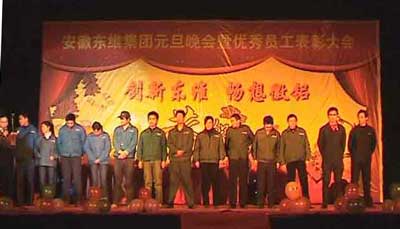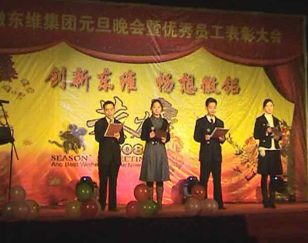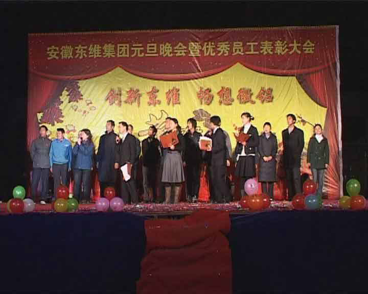 2007 年 1 2月 31 日晚 6 时,冬季的寒风中,在徽铝铝业厂房内却暖意融融,安徽东维集团元旦晚会暨优秀员工先进集体表彰大会正在热烈的气氛中举行。 2007年是东维硕果累累的一年,2008 年是企业集团模式运作的第一年,是效益年、管理年、培训年。我们将凝聚起全体员工的力量去努力、去拼搏,去迎接新的辉煌!基于此,整场晚会以“创新东维,畅想徽铝”为主题,驾梦想之舟,扬激情之帆,让参加晚会的近千位东维人都畅游在自豪与欢笑的海洋中。本台晚会邀请了当涂著名民歌演员及当涂文化局专业文艺队伍助阵,加之公司员工,演员阵容近百人,精心设计安排的二十多个节目中,还穿插了激动人心的表彰、抽奖活动,使整台晚会高潮迭起,掌声不断。晚会上,公司员工用歌声、用舞姿,用精心编排的小品表达对公司的热爱之情,自豪之情。 晚会上集团领导作了重要讲话,共同祝贺集团全体员工新年快乐,展望2008年的发展规划,并与全体员工一起高声朗诵“东维励志篇”,将晚会推上了又一个高潮。 2008,我们干劲十足!让我们共同努力,期待新的收获!